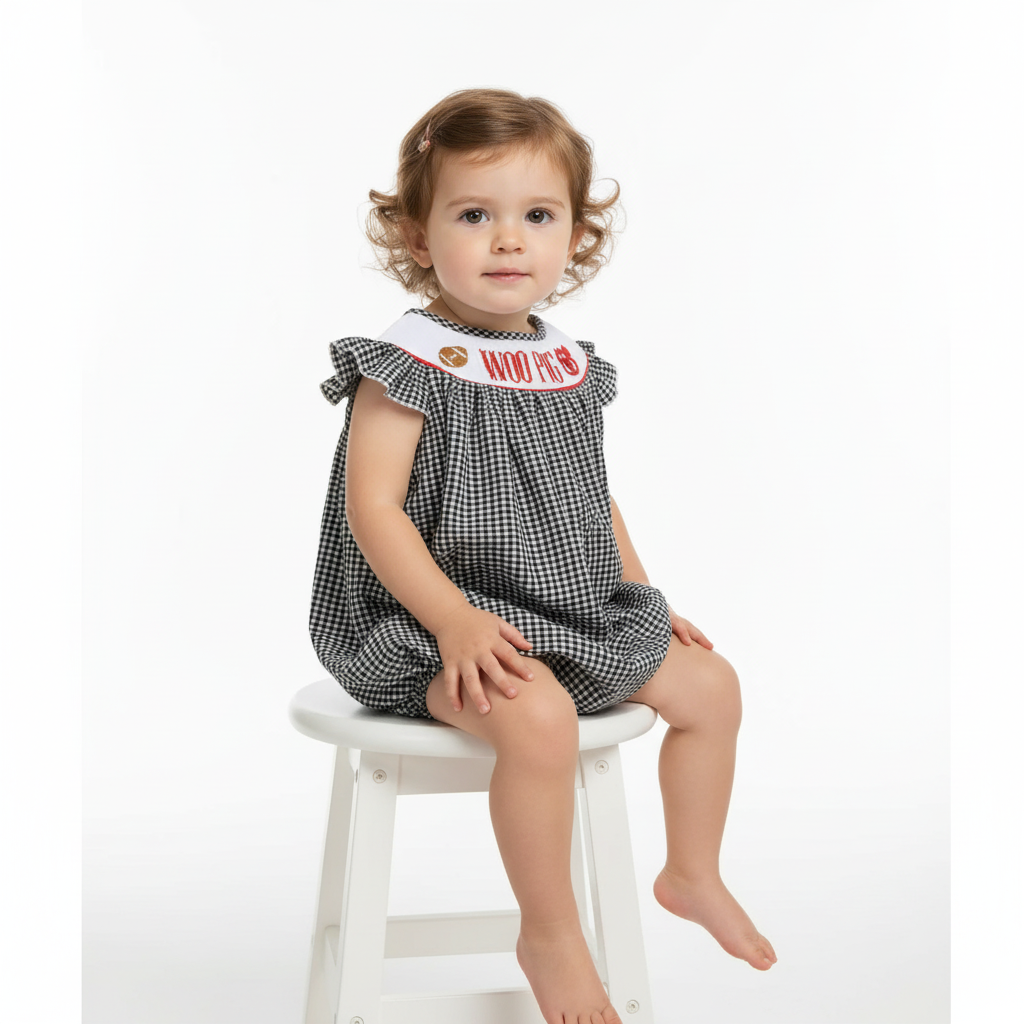 Introducing the Arkansas Bubble, the ultimate romper for any fan of the Razorbacks! "Woo Pig Yall" and featuring the iconic Arkansas team logo, this machine-smocked romper offers both style and comfort for game day or everyday wear. Show off your team spirit with confidence and support your team with every step. Go Razorbacks!