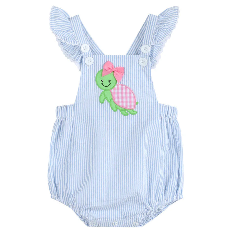 This delightful light blue seersucker romper is perfect for your sweet little one! Fluttery sleeves, criss cross back and a turtle applique detailed with a cute pink bow make this the perfect outfit for playtime or special occasions. Finished off with an adorable bow on the back for an extra touch of sweetness. Snaps at the crotch allow for easy diaper changes .