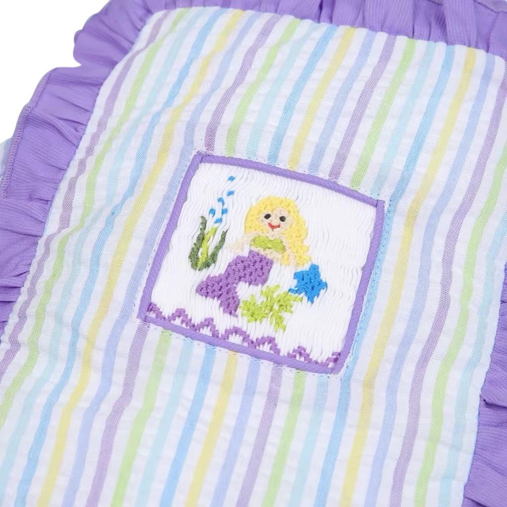 Feature: Nice swimsuit for little girl with Little Mermaid handmade smocked pattern in the middle. Neck string.