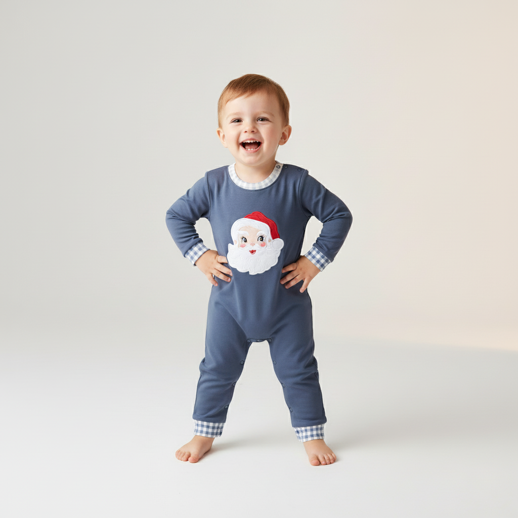 Celebrate the holiday season in style with this Navy Christmas Santa Claus Applique Romper. Soft and comfy, it features a charming Santa applique that brings festive cheer to your little one's outfit. Perfect for holiday photos and cozy winter days, this romper combines playful design with easy wearability for joyful celebrations.
