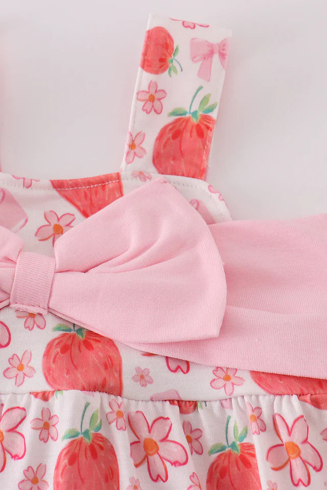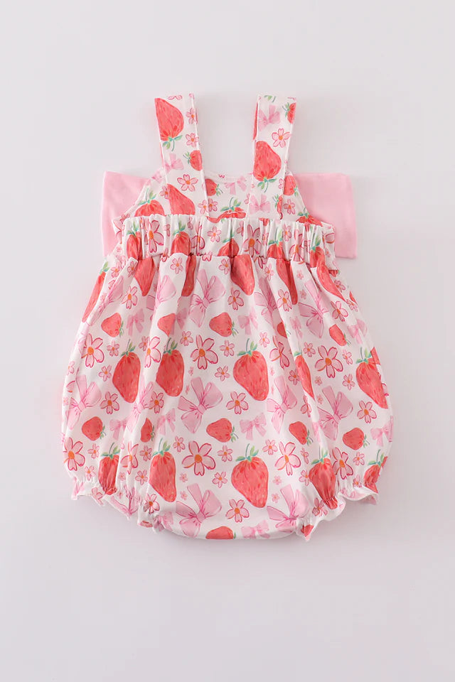 Add a fruity touch to your little one's wardrobe with our Pink Strawberry Print Bow Bubble! This adorable bubble features a playful strawberry print and a cute bow detail. Perfect for sunny days and photo shoots, your baby will look sweet as a berry!