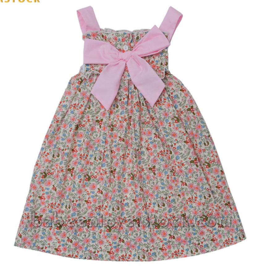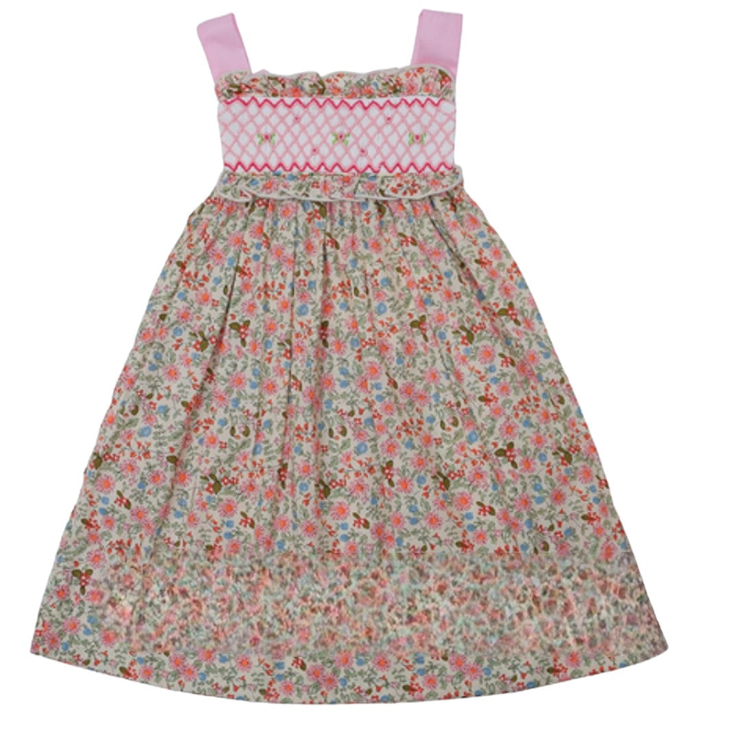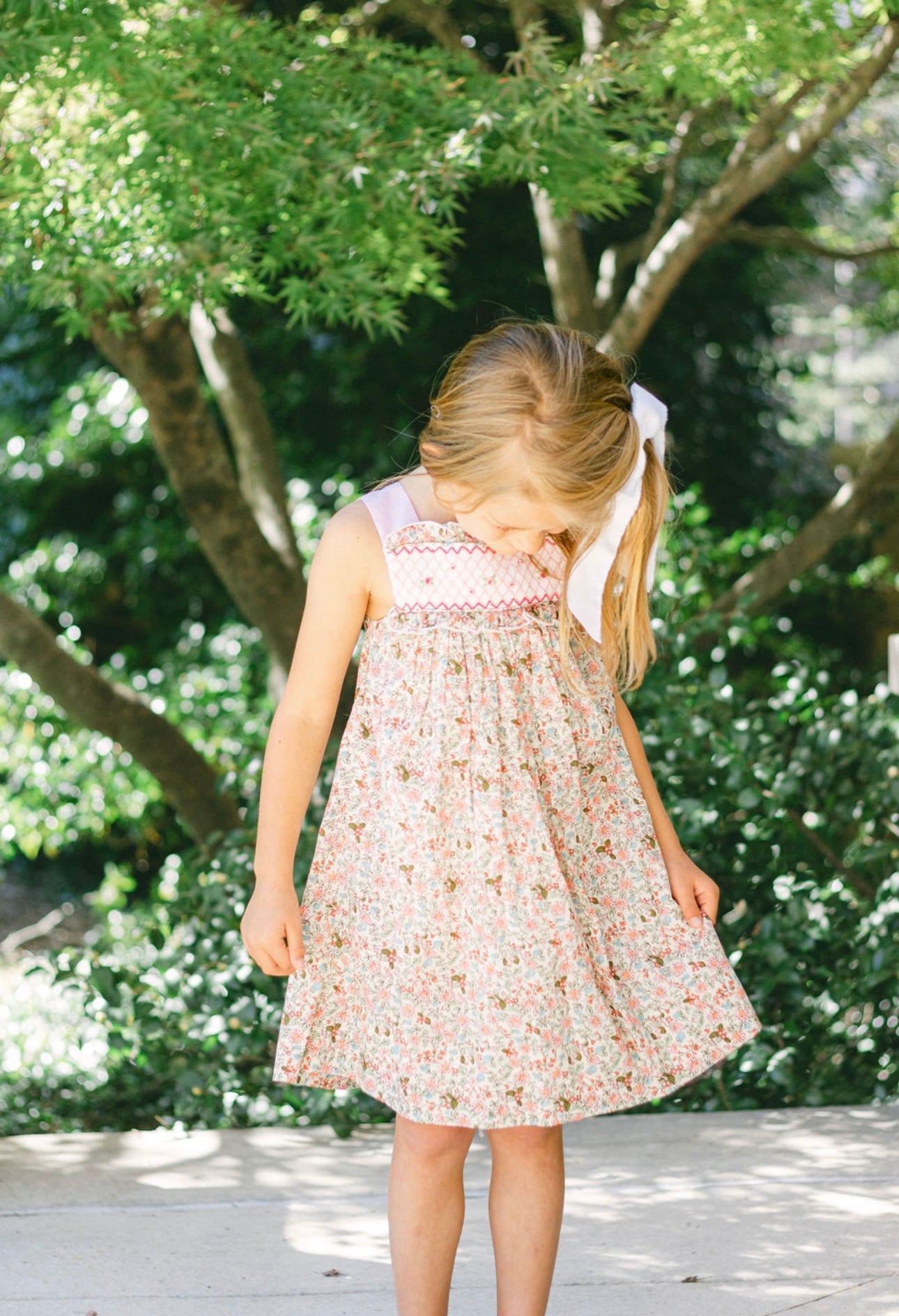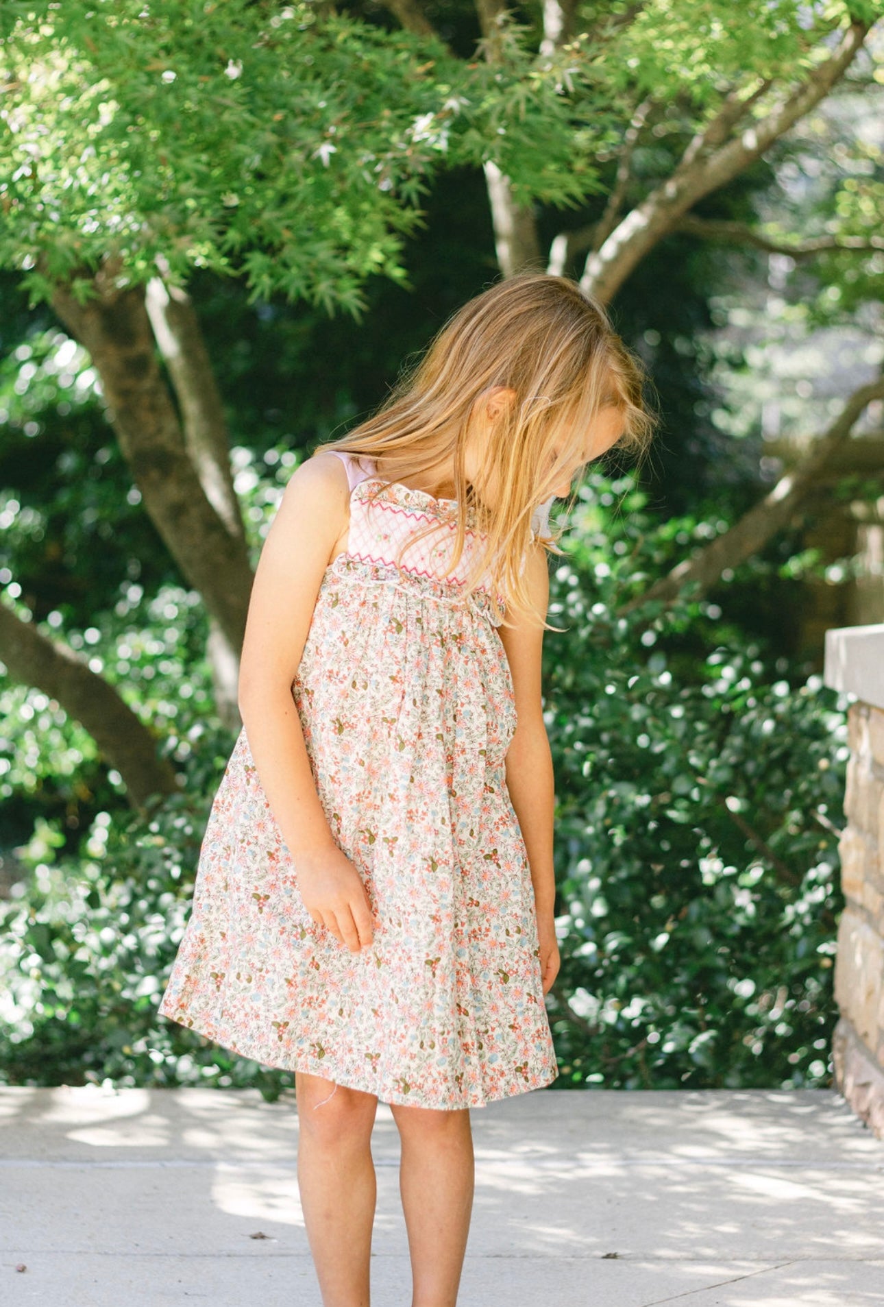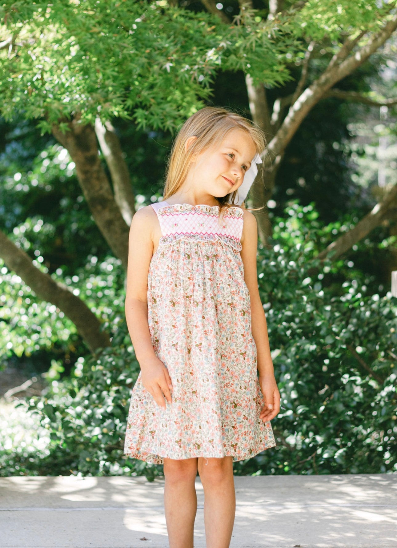 Sleeveless floral hand smocked dress with geometric smock and back sashes